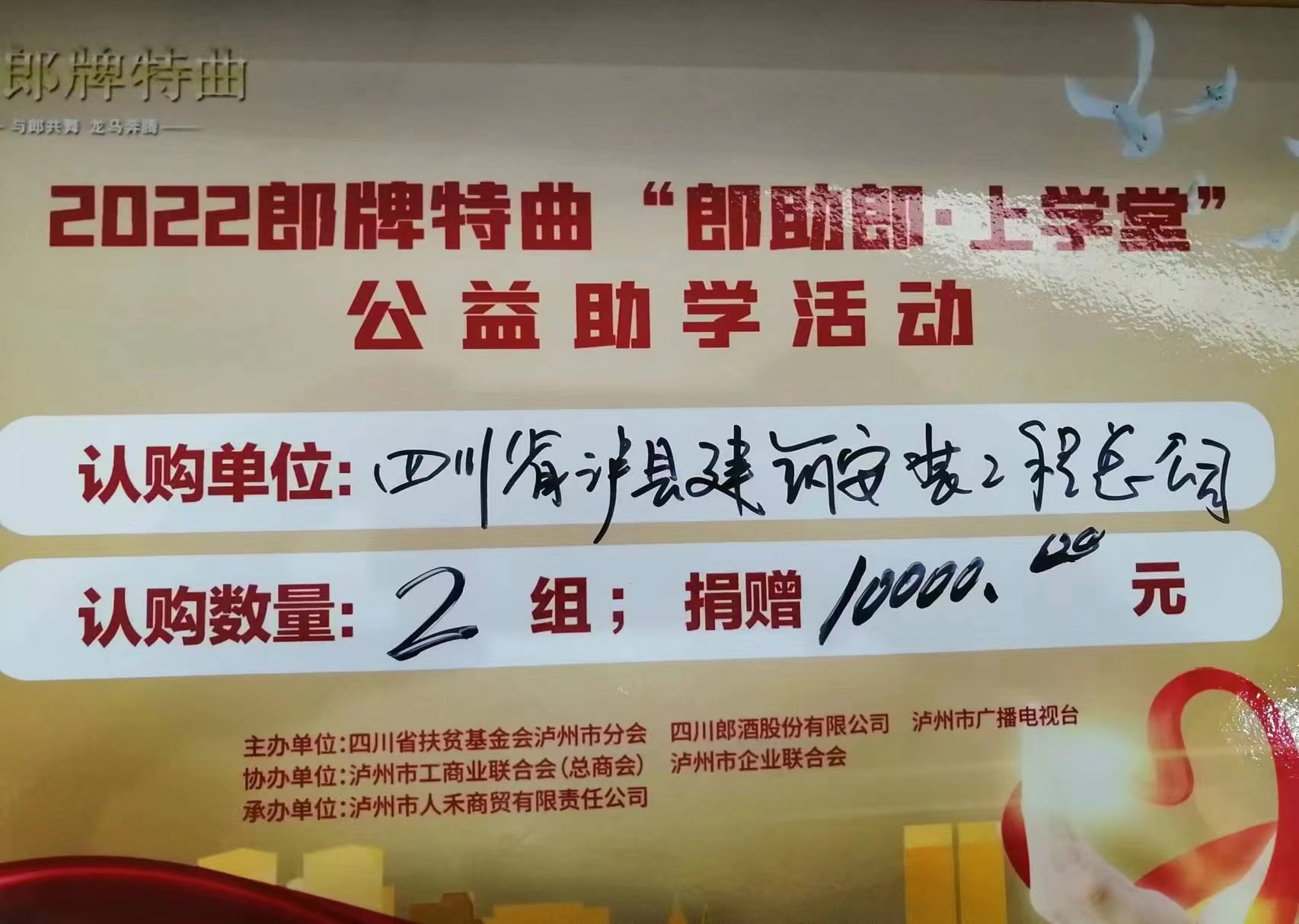 2022年6月17日上午,本次義賣活動如期舉行。四川省瀘縣建筑安裝工程總公司也參加了此次活動,并認(rèn)購了兩組價值一萬元的郎酒。為貧困學(xué)子撐起一片愛的藍(lán)天。